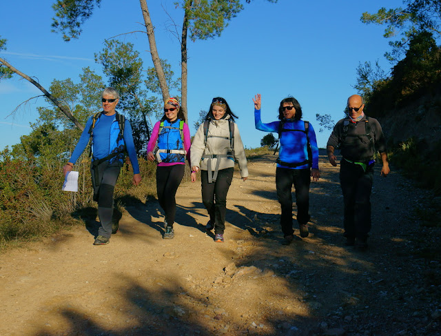 Ya llevamos un buen rato caminando y aprovechamos para comer en la Collada de La Clota bajo la sombra de unos pinos. Repuestas nuestras fuerzas iniciamos un nuevo tramo de ascenso, mayoritariamente por estrechos caminos, hacia el Puig de Les Agudes.